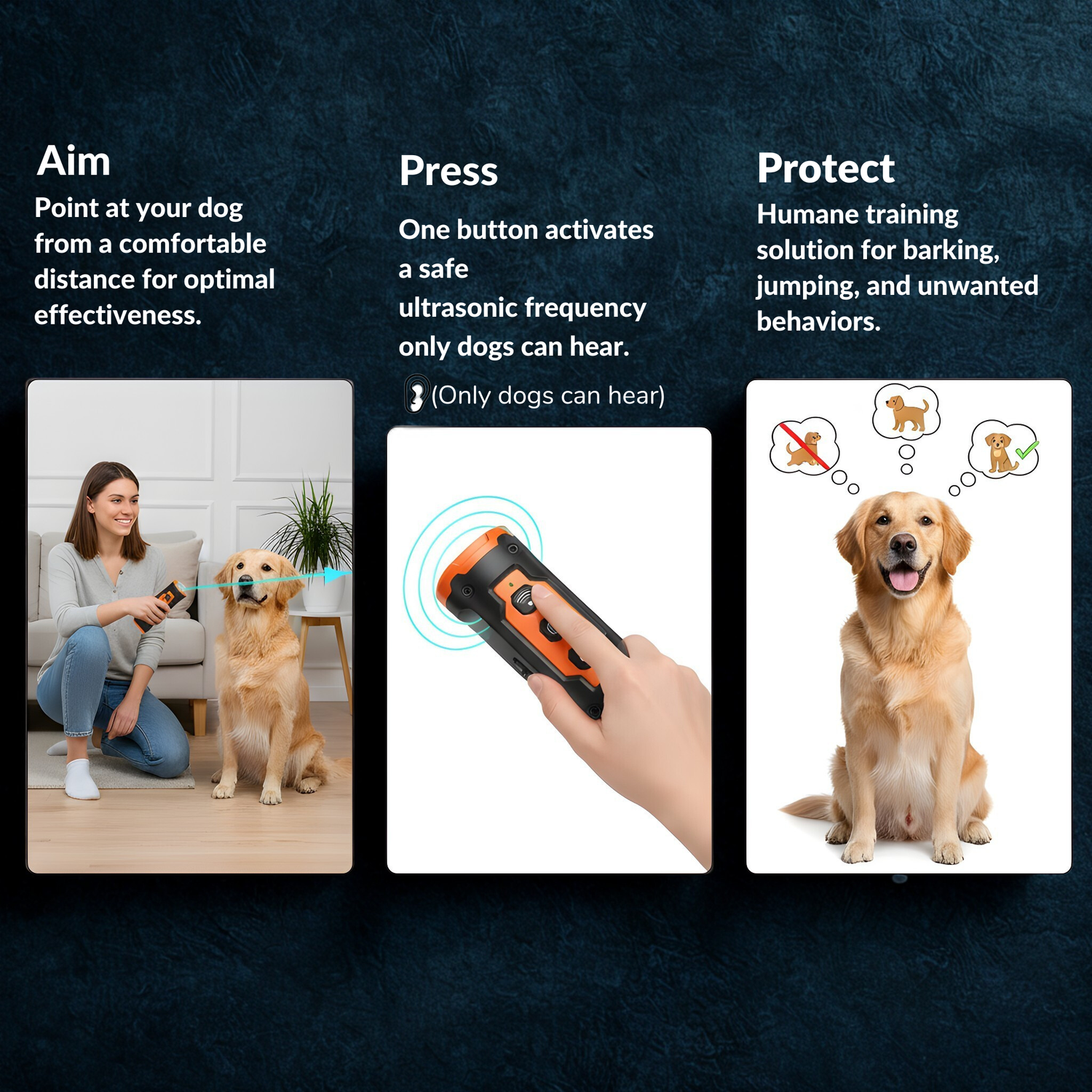 Press — One button activates a safe ultrasonic frequency only dogs can hear.